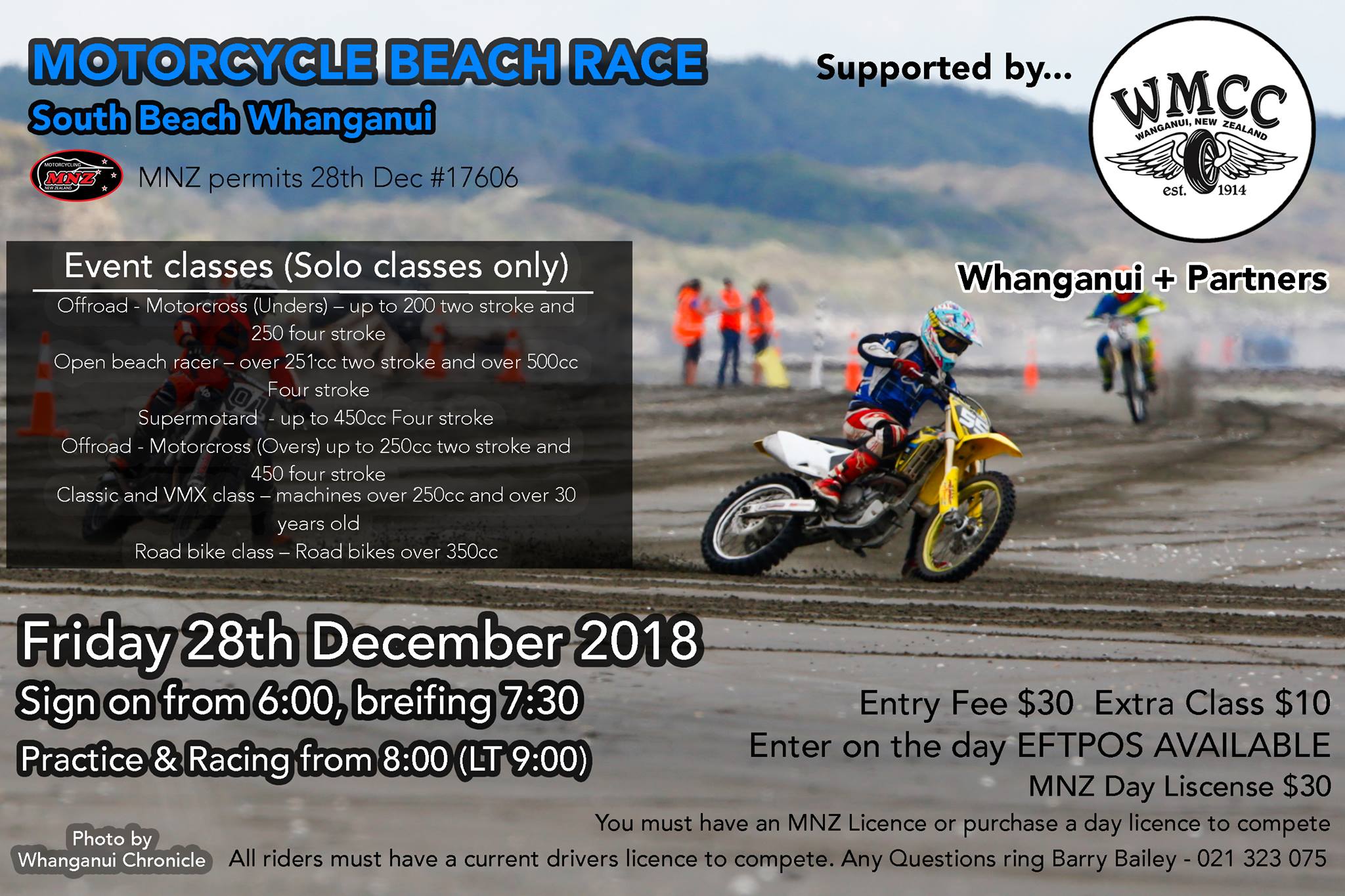 - ALL RIDERS MUST HAVE A CURRENT NZ CIVIL DRIVERS LICENCE TO COMPETE ON THE BEACH AS IT IS DESIGNATED A CLOSED PUBLIC ROAD.