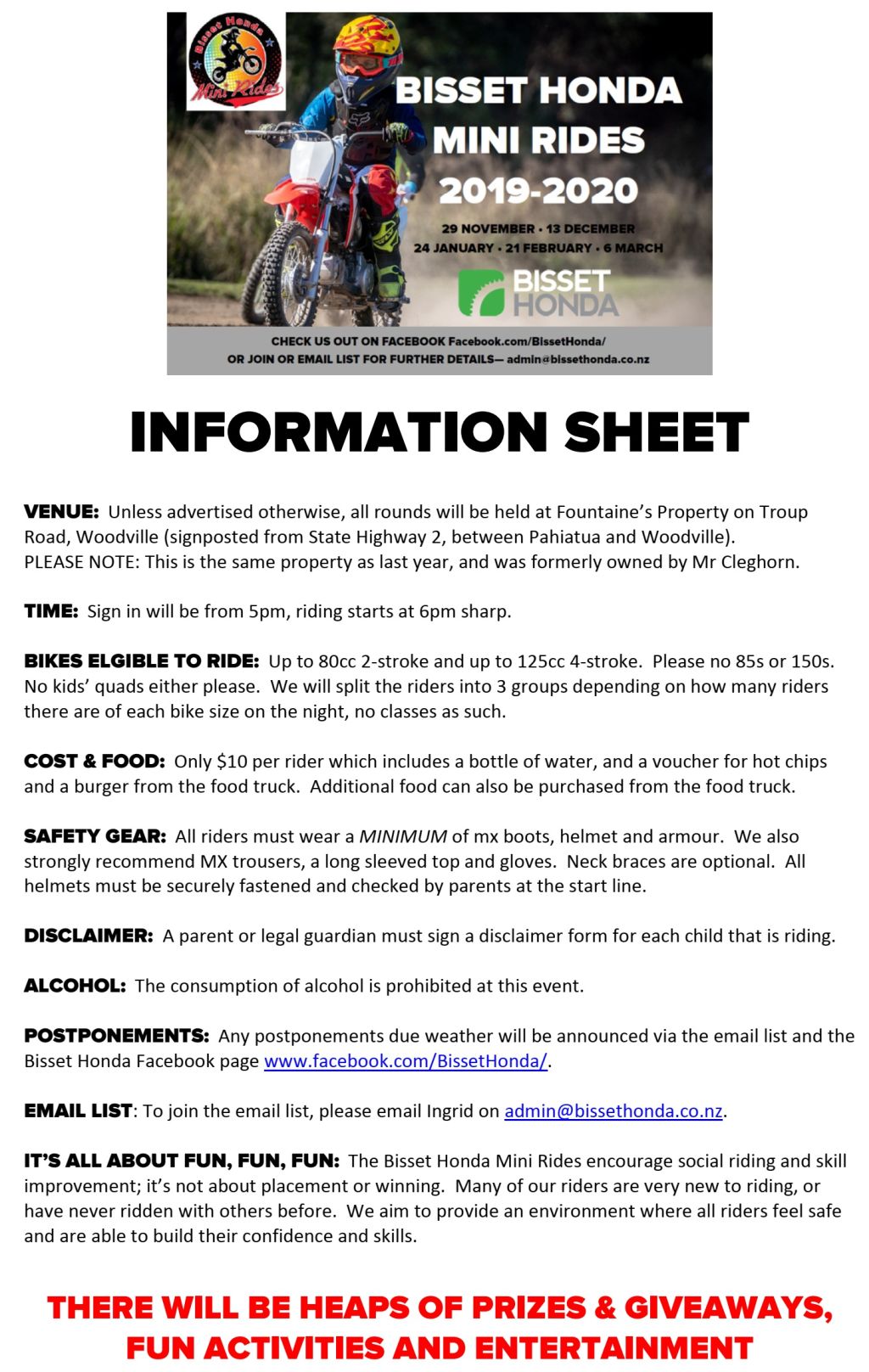 POSTPONEMENTS: Any postponements due weather will be announced via the email list and the Bisset Honda Facebook page