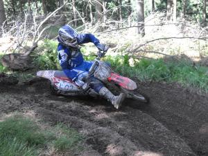 Karl took over and started eating into the 40 second lead of the Mead/Smith Yamaha combination and a seesaw battle ensued for the next three laps. Riding Honda for the first time in four years, it was taking Karl a bit of time getting used to the set up that Chris runs. “The suspension was set for Chris (a podgy 10kg heavier) so I was getting some big hits from time to time but after a while I adjusted and settled into the race” said Karl. “It’s damn slippery out there and you really have to be careful on the blind corners”. Returning recently from the USA riding the GNCC series with Paul Whibley, Karl was ready to kick some ass.