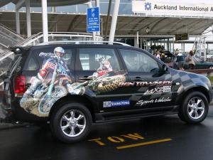 Silver-Bullet's set-up allows for only one photo per article. So I have added this posting to include the shot taken by Shayne Rice this morning showing the spectacular graphics on the SsangYong Rexton: that Ben will be driving while in New Zealand. (Don't think it will suit you Vicki!)