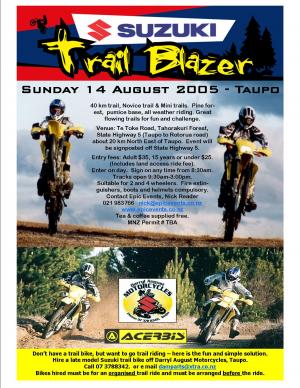 Taking place 14 August 2005, just out of Taupo. With awesome trails and the involvement of Suzuki, Acerbis and Daryl August motorcycles, this ride will be a ripper!