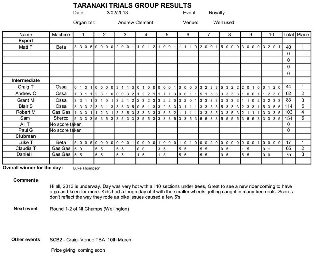 Te Kuiti Sprints, RESULTS